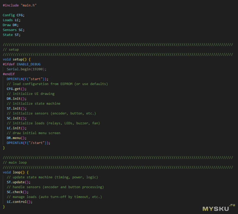 Здесь видны все сущности которыми оперирует программа: конфигурация, нагрузки, рисовалка, сенсоры и состояния. Осуществляется инициализация сущностей а затем идет обработка их возможных изменений.