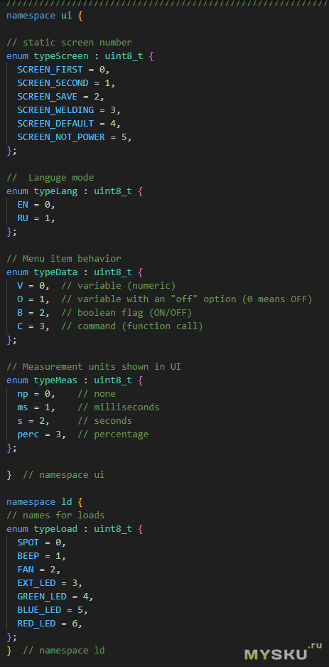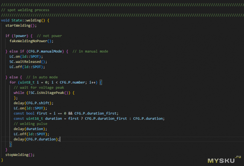 Здесь видны все сущности которыми оперирует программа: конфигурация, нагрузки, рисовалка, сенсоры и состояния. Осуществляется инициализация сущностей а затем идет обработка их возможных изменений. Естественно что в режиме самой сварки отключаются прерывания, вот обработчик нажатия кнопки сварки:
