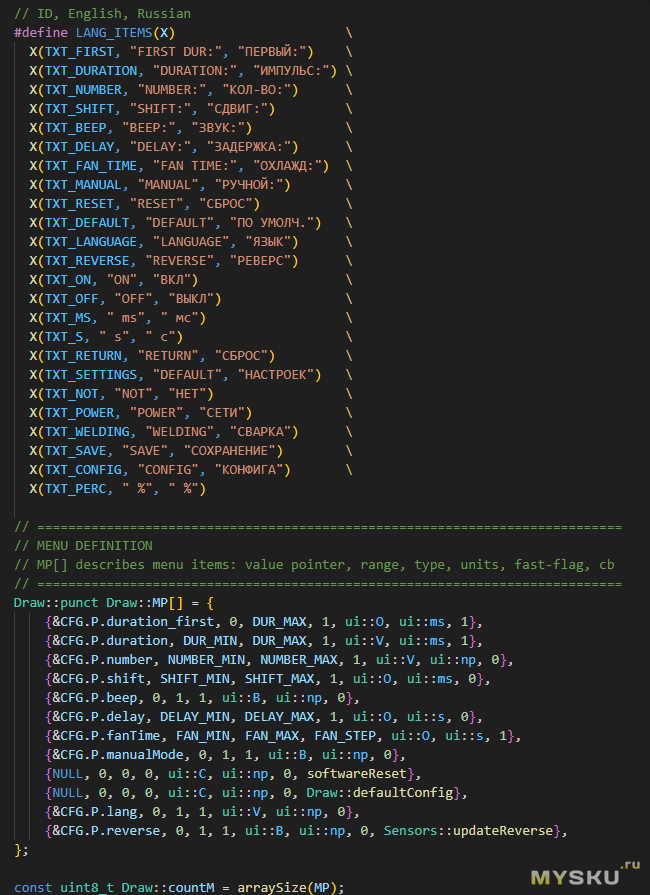 Первым мы видим словарь для поддержки языковДалее идет инициализация самого меню — каждая строчка это отдельный пункт