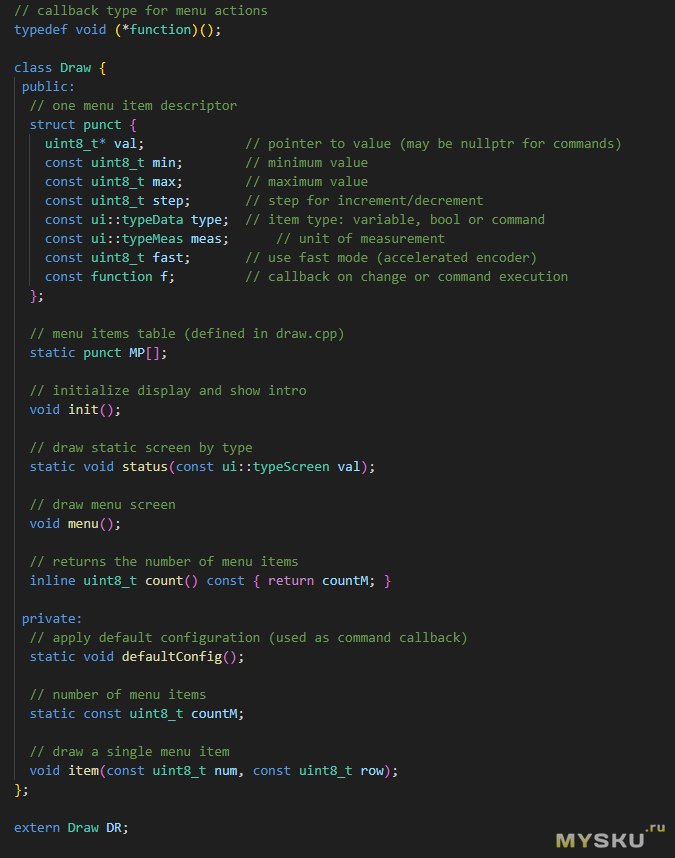 Мне показалось, что такая организация меню для данного устройства выглядит вполне оптимально, и вы вполне можете нечто подобное использовать в своих устройствах.Основной файл программы выглядит достаточно просто: