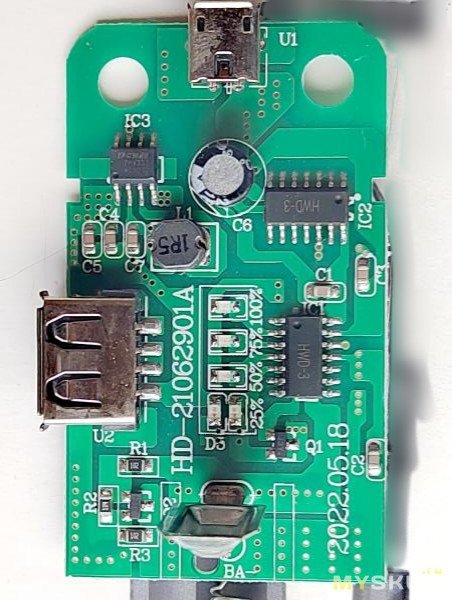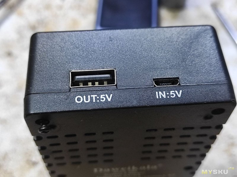 На верхней грани вход microUSB и выход USB.Выход usb должен работать от правого аккумулятора, но не работает.