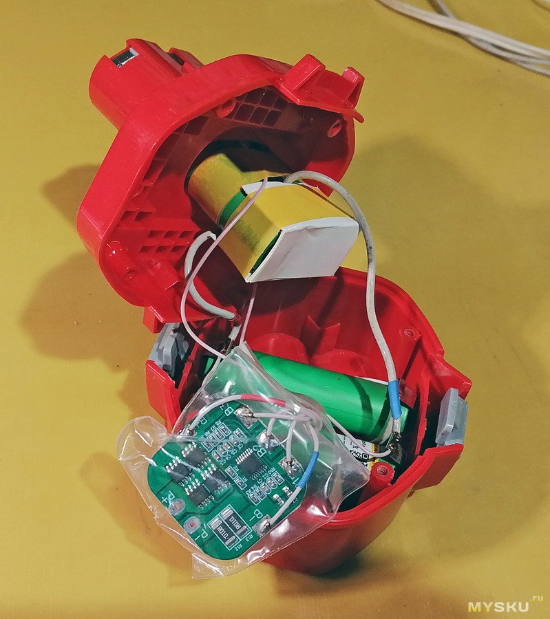 Разборный блок АКБ шуруповерта был переделан на 4 литиевых батареи 18650 по схеме 4S. Две батареи поместились в тубус, и еще две расположены на дне коробки. Для балансировки используется плата от какой-то списанной аккумуляторной сборки. Периодически сравнивал тестером напряжение на банках — работает исправно. Выводы платы P+ и P- не используются.