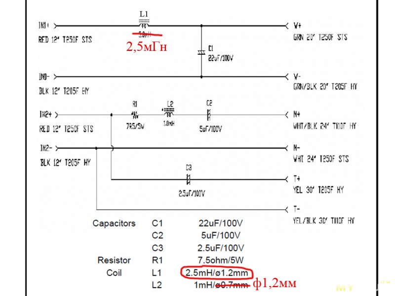 Тут же можно видеть АЧХ с разными фильтрами (индуктивности 3..5мГн и ёмкости 22..102мкФ).Решил использовать родную индуктивность 2,5мГн (местами будет встречаться надпись «3мГн»), не увеличивая её значение «добавкой» 1мГн.