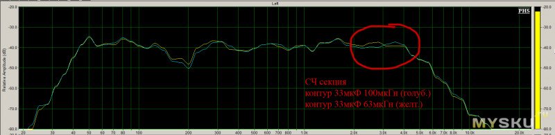 По факту получается, что НЧ динамик работает до 1кГц и выше (замер микрофоном,см. график жёлтым цветом.):