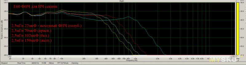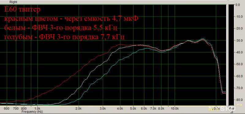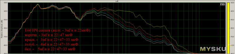 АЧХ голубым цветом — родной ФНЧ Е60Выбрал вариант 2,5мГн и 102мкФ (график белым цветом как наиболее оптимальный).