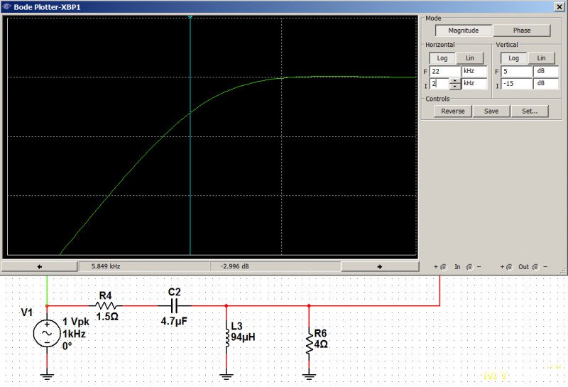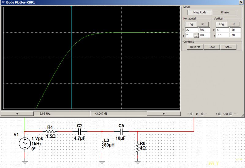 Частота среза 5кГц (-3дБ).Но почему-то СЧ-ВЧ секции плохо стыковались по АЧХ, поэтому пришлось переиграть на фильтр 2-го порядка: