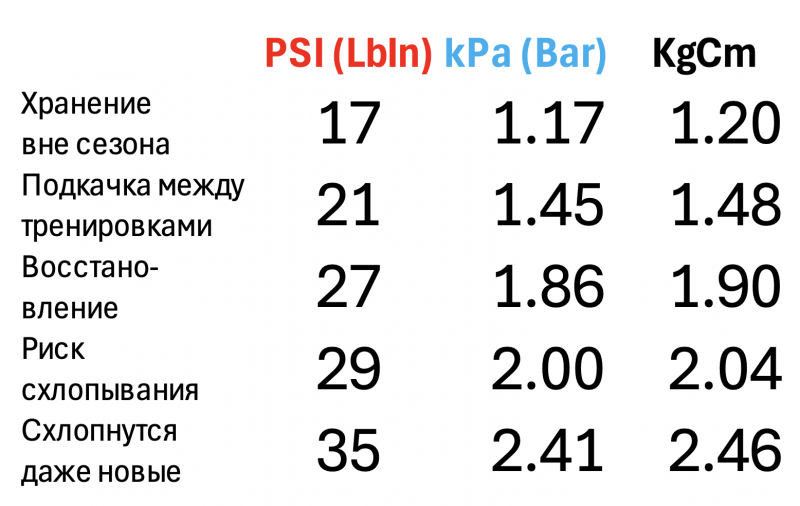 Теперь к техническим деталям. Перерыв форумы, собрал вот такую эксельку с рекомендованными значениями давления: