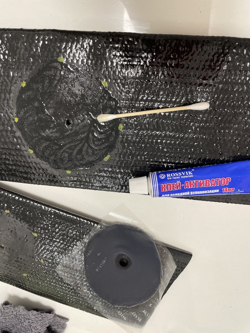 Зачистил наружный глянцевый слой до резины дремелем и наждачным кругом, и приклеил ниппель Росвик на активатор. Правда, дальше выяснилось, что резина рукава отличается от резины для покрышек и ниппель просто отвалился.