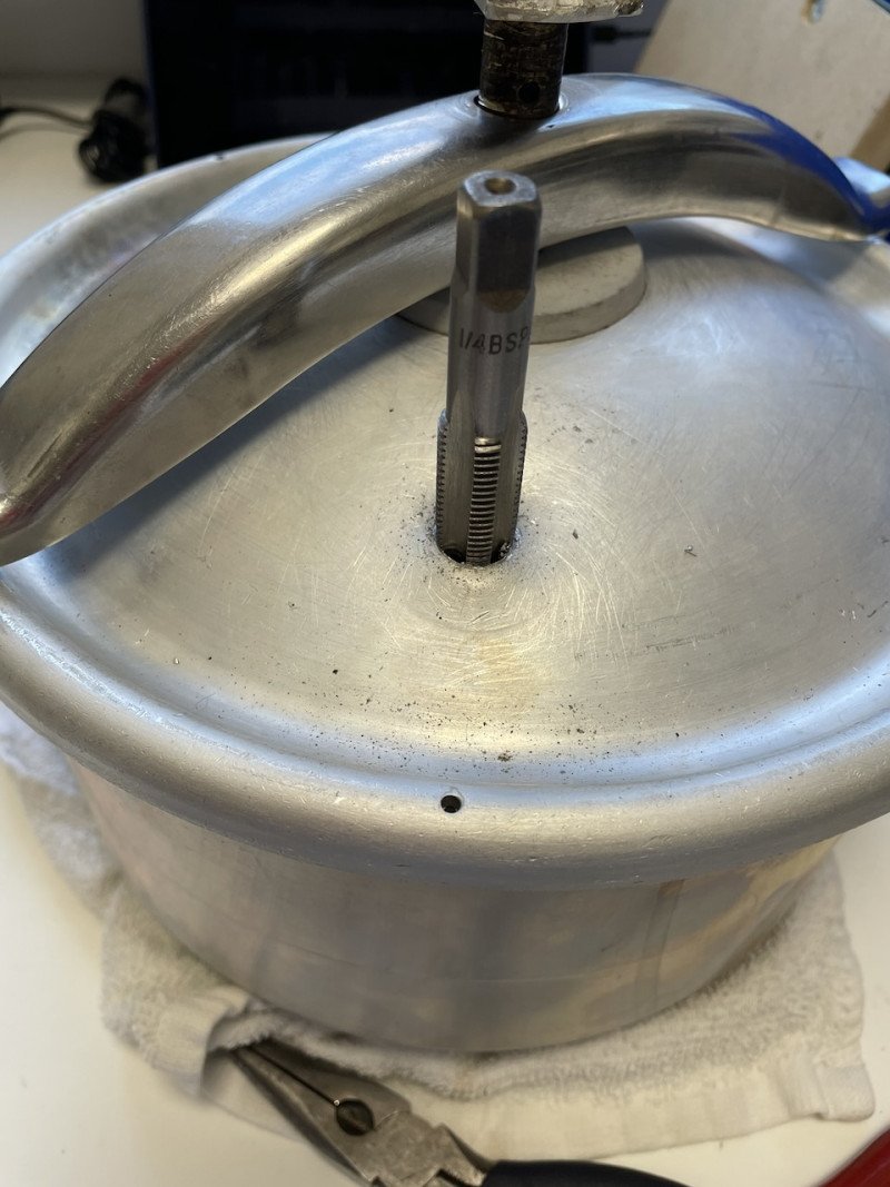 Меня осенило, и за 500 рублей на той же самой барахолке была куплена советская скороварка с дохлым клапаном. Заказал для неё новый силиконовый уплотнитель, и в ожидании доставки полез заменять клапан на ниппель. Посколькусоветские микросхемы — самые большие микросхемы в мире, алюминия в СССР никто не жалел, резьбу было нарезать просто, влезло три витка: