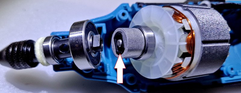 Ну надо же, как по красоте сделано!Ротор крутится на своих двух подшипниках, а выходной вал — на своих, тоже двух, а соединяются они через муфту с резиновым демпфером /показан стрелкой/: