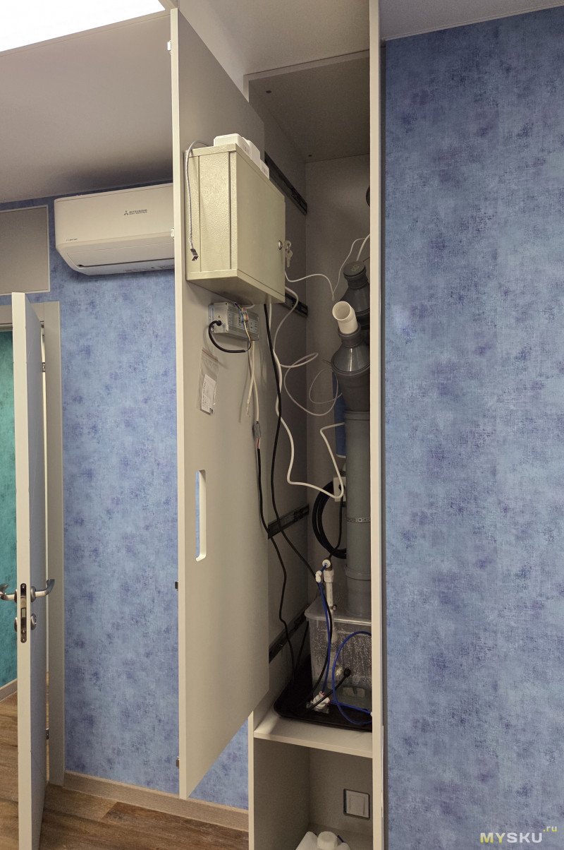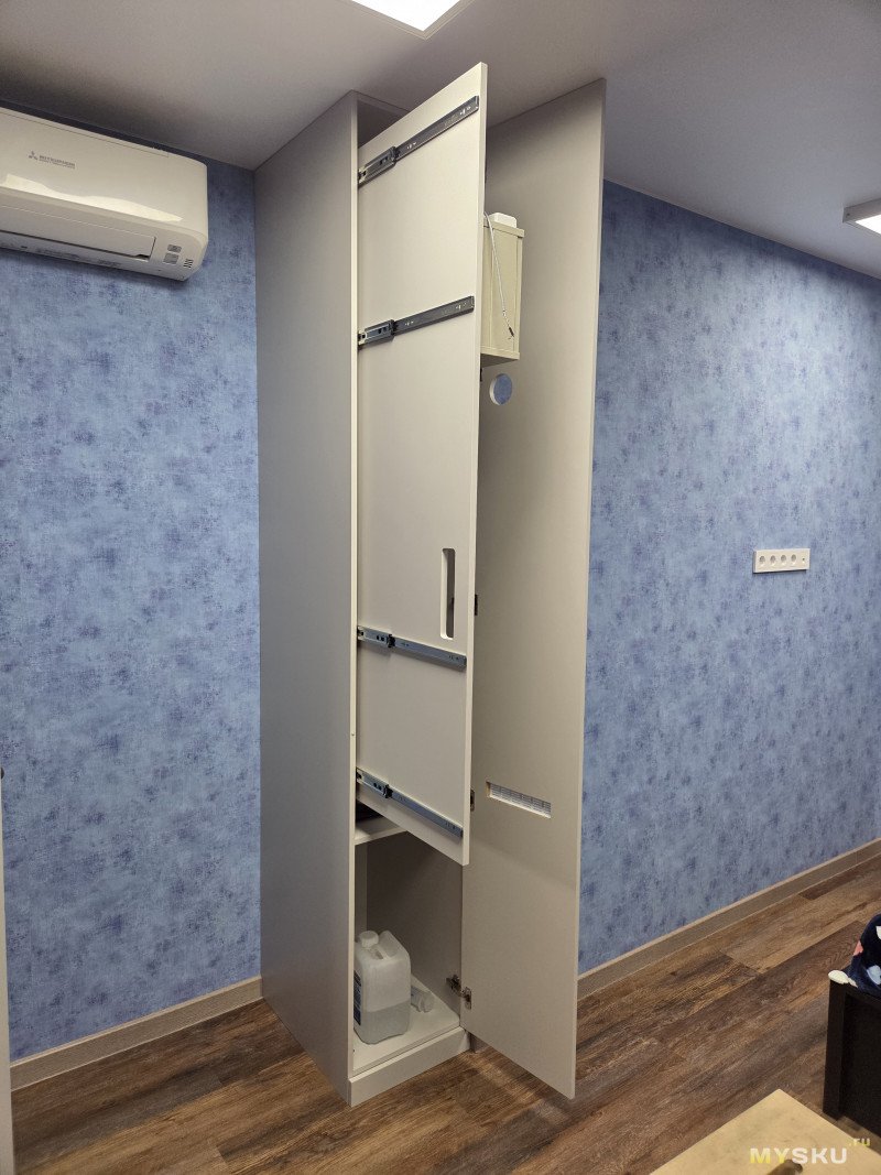 Выдвижную стенку сделал большую, под возможные доработки и ради свободы размещения компонент. Дверь на разъёмных петлях, я её снял когда, монтировал щит.В ящике установлен отдельный датчик влажности, для контроля влажности в шкафу. Как и ожидалось там стабильные 50%, как и снаружи.