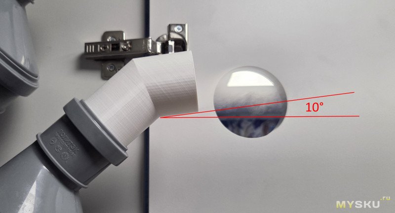 Сопло напечатано на 3D принтере, так чтобы выход был не горизонтально, а под углом 10 градусов к горизонтали.