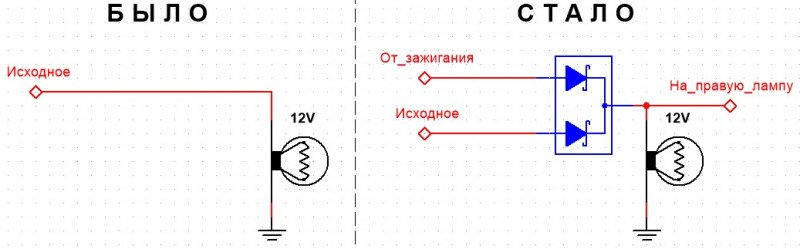 Теперь подсветка загорается как при штатном включении под рулём, так и при повороте ключа в замке зажигания, модификация не затрагивает заводские режимы.