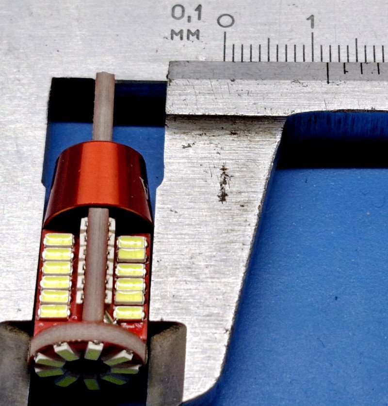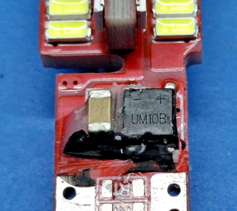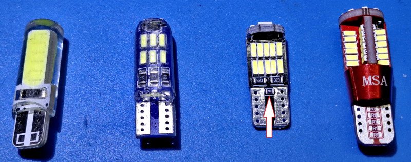 На третьей лампе красной стрелкой помечена т.н. «обманка» — резистор на 1к, без которого компьютеры некоторых особо умных авто определяют светодиодные лампы как неисправные и выдают ошибку.