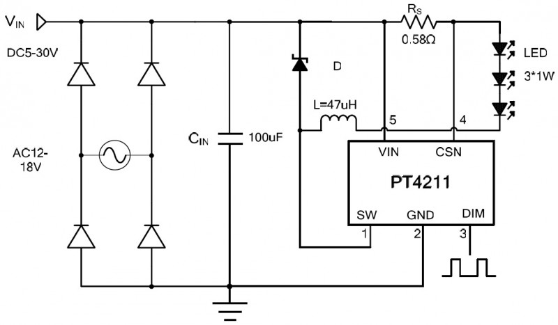 Есть даже отдельный вход ШИМ-диммирования, где-то в другом месте может и пригодиться.Типовая схема реализована практически без изменений, только резистор стоит чуть больше: