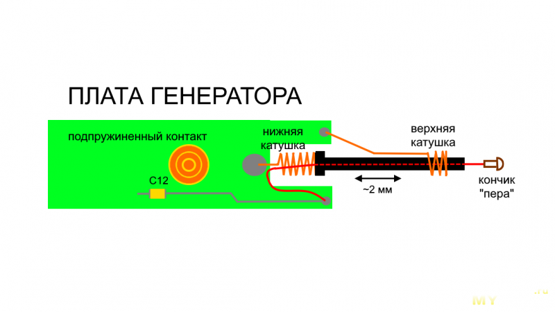 Верхняя и нижняя катушки одним концом посажены на «землю». Причем нижняя стальная катушка (из шести витков) работает как пружина, в нее упирается основание трубки с антенным наконечником. Верхняя катушка жестко зафиксирована, ее три витка накручены на пластиковый корпус, об этом я писал выше. Таким образом, перо стилуса и плата генератора предположительно выглядит так.