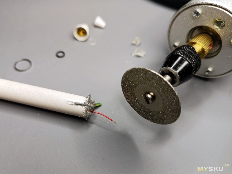 Алюминиевый стакан в корпусе сидел так плотно, что пришлось надрезать сочленение. Потом пришлось еще и резать стакан вдоль. Для это взял миниатюрную дрель с двигателем ДПР-42 и тонкий алмазный диск для дремеля. Иного способа добраться до «мякотки» я не нашел.