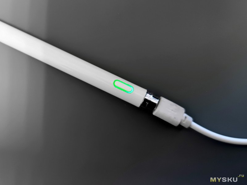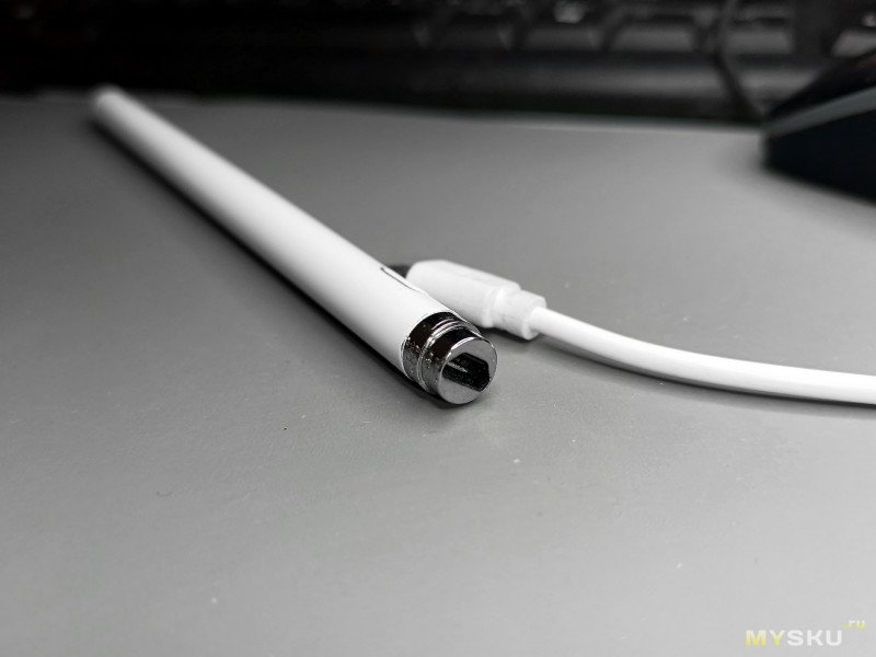 Корпус девайса выполнен из алюминия. Наконечник тоже из металла — и конус, и рабочий кончик пера. Порт зарядки Micro-USB находится в торце устройства. Рядом расположена кнопка питания с RGB индикацией.