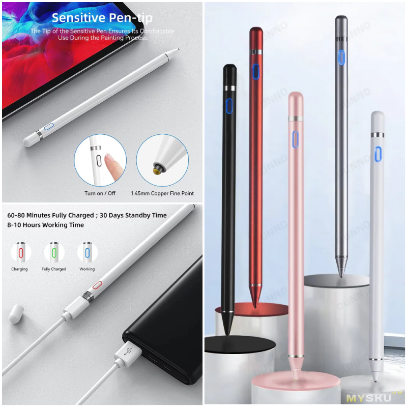 Кстати, эта модель стилуса еще продается на Алиэкспрессе по цене 10 долларов за штуку. Но ее постепенно вытесняет более дешевая пластиковая модель. У нее граненый корпус, похожий на карандаш и сменные наконечники. Тут уже имеется порт Type-C и четыре светодиода уровня заряда. Явно прогресс налицо. Но вернемся к герою обзора.