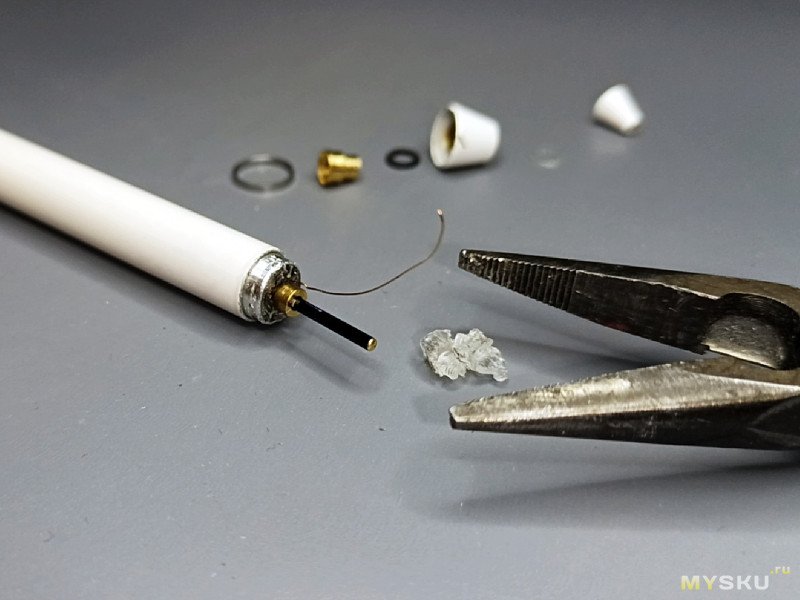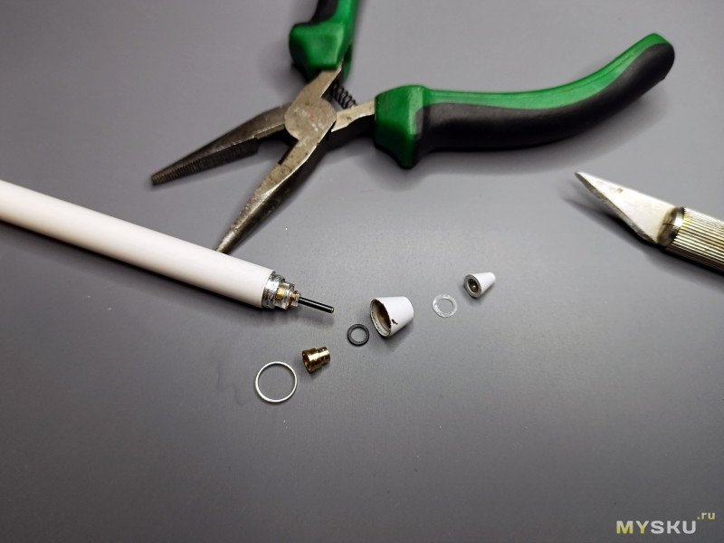 Начну с рабочей части, т.е. «пера» стилуса. Понадобятся плоскогубцы и скальпель. После отделения конусов и прокладок открывается рабочая зона. В этом месте стилус состоит из шести элементов.