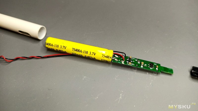 Теперь посмотрим на модуль зарядки. С небольшим усилием (расшатываю) снимаю колпачок с прорезью под порт micro-USB и вытягиваю плату с аккумулятором. Плата обозначена как E8910-V5.0. Аккумулятор цилиндрический — ET 75400A-110 Li-Ion 3,7В.