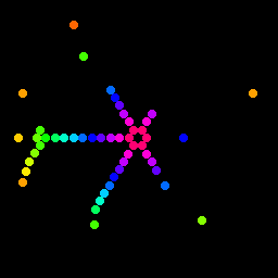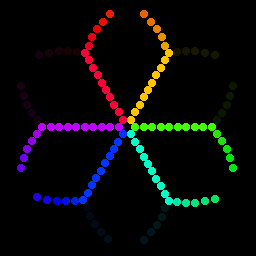 Бегающие огниНемного схоже с эффектом радиальной волны, но тут не полная волна пробегает, а что-то вроде отдельных точек. Достаточно сильно модифицируется параметрами, направление (расходящиеся, сходящие, пульсирующие), одна или две точки одновременно на каждом луче, сдвиг точек по фазе, дающий эффект спирали. Вот два примера вариабельности: