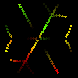Координаты диодов рассчитаны как в декартовых координатах (0-255 по X и Y), так и в угловых (угол от вертикали и расстояние от центра, оба параметра 0-255). Одно в другое можно легко пересчитать программно. Для такой формы, как снежинка, проще вручную задать угловые координаты, а программно пересчитать в декартовы. Для других узоров, возможно, будет проще наоборот, забить константы X-Y, а в угловые пересчитать программно. Для снежинки я добавил ещё одну «координату», по ней можно определить, к чему относится диод, центральной точке, основному лучу или боковым отросткам. Это тоже можно использовать в эффектах. Только когда готовил иллюстрации к этому тексту, я заметил, что не совсем точно задал угловые координаты для второстепенных лучей, получились слегка куриные лапки. Ну и ладно, запишем криворукость в фирменный авторский стиль.