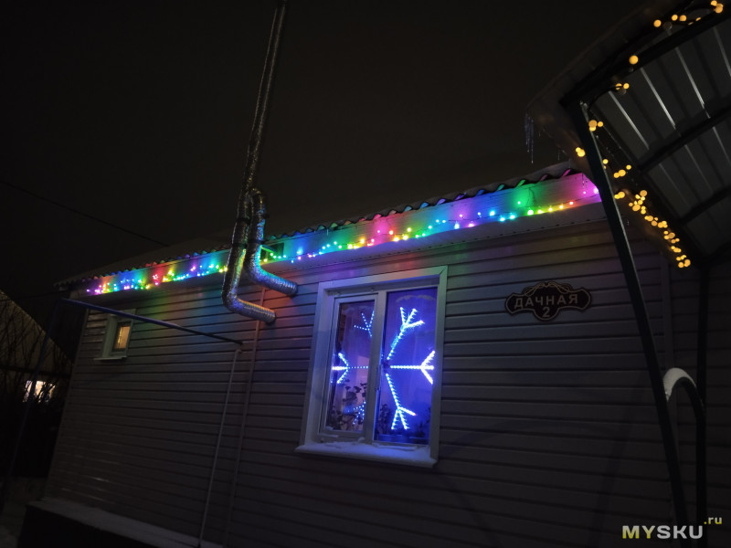 На доме у меня и гирляндой (там такие крупные диоды, как круглая лампочка в 9-10 мм) так и на ленте. Лента вокруг окон и вертикально по бокам. Вообще, я взял ленту, залитую силиконом, у нее влагозащита заявлена. Но потом подумал и запихнул в профиль для лент. Как оказалось, правильно сделал, силикон на солнце желтеет, на свечение может и не повлияет, но днем выглядит не очень. Профиль же защищает. Торцы я даже не заделывал никак (надо бы, но не от влаги, а от насекомых). Так что проще было брать обычную ленту и профиль. Что касается влаги, то я экспериментировал до этого. Электроника легко живет на улице, если нет дождя и росы. А роса выпадает под открытым небом, на стене дома ее нет. Тепло излучением улетает в космос и предметы остывают быстрее, чем воздух, оттуда и роса. Под козырьком такого не происходит. Гирлянду сделал в начале зимы, сейчас проблем не возникло за это время. Для чего то ответственного такой подход не катит, а гирлянда вполне думаю жить будет.