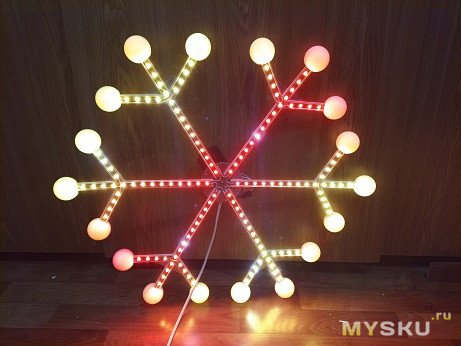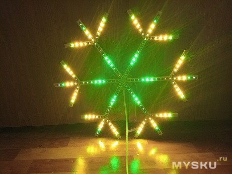 В каждом луче схема соединения аналогична маленькой снежинке. Что радует, паять тут столько же, хоть и размер в 5 раз больше. Над лентой тут нет крышки-рассеивателя, для любования с большого расстояния она и не требуется, светодиоды слепят только вблизи. Да и красоту особо наводить не требуется, с улицы не видно, далеко, а изнутри помещения изнанка вполне приличная. Так что я повода фиксировал термоклеем, только чтобы они не попадали в свет диодов, не перекрывали их.