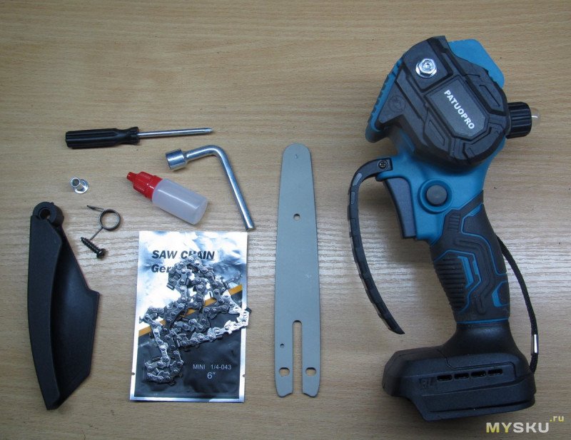 Комплектация минимальная — тушка, цепь, шинка, щиток с крепежом и пружинкой, отвёртка и ключик для натяжки цепи. Даже дурацкой инструкции нету. Есть маслёнка с парой миллилитров масла
