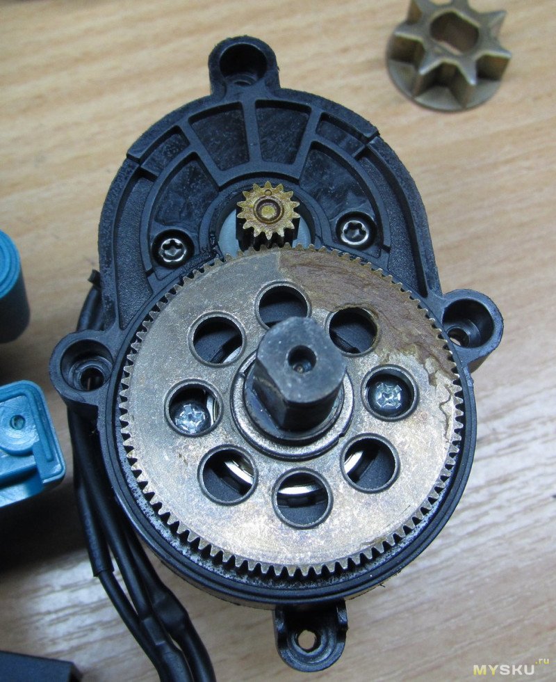 Редуктор как-бы смазан, но смазка не на шестеренках, а на корпусе. кстати, корпус пластиковый, но я не вижу тут проблемы, особенно за эти деньги. перераспределил эту смазку по шестерням — как раз хватило.
