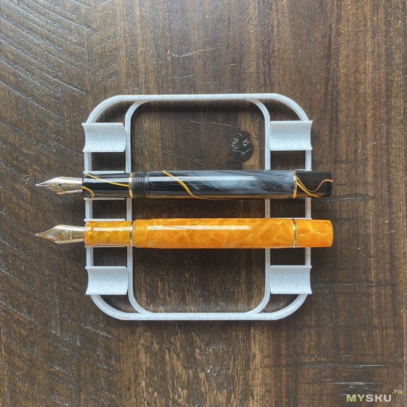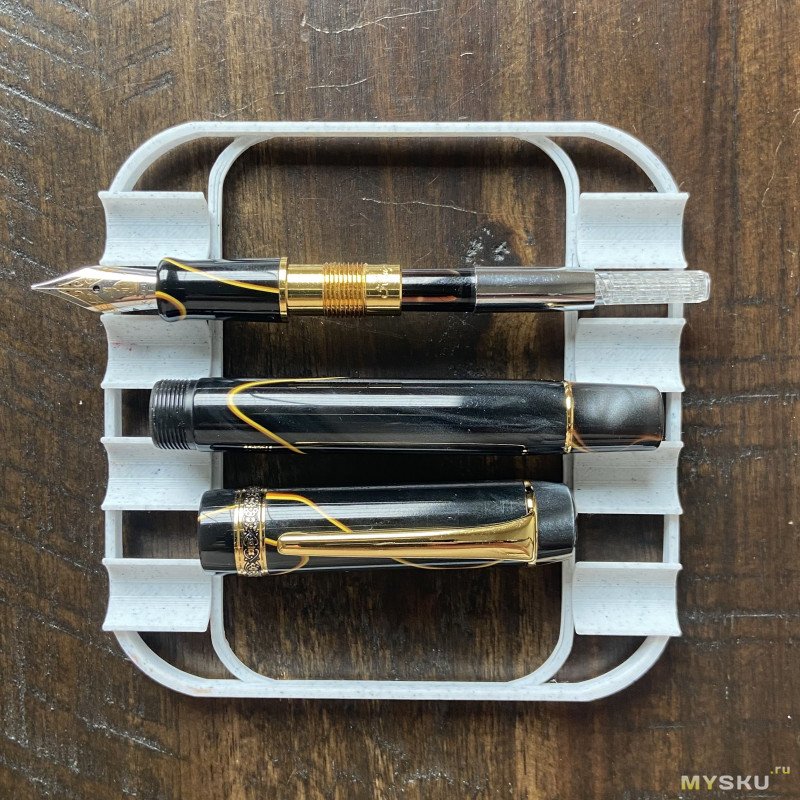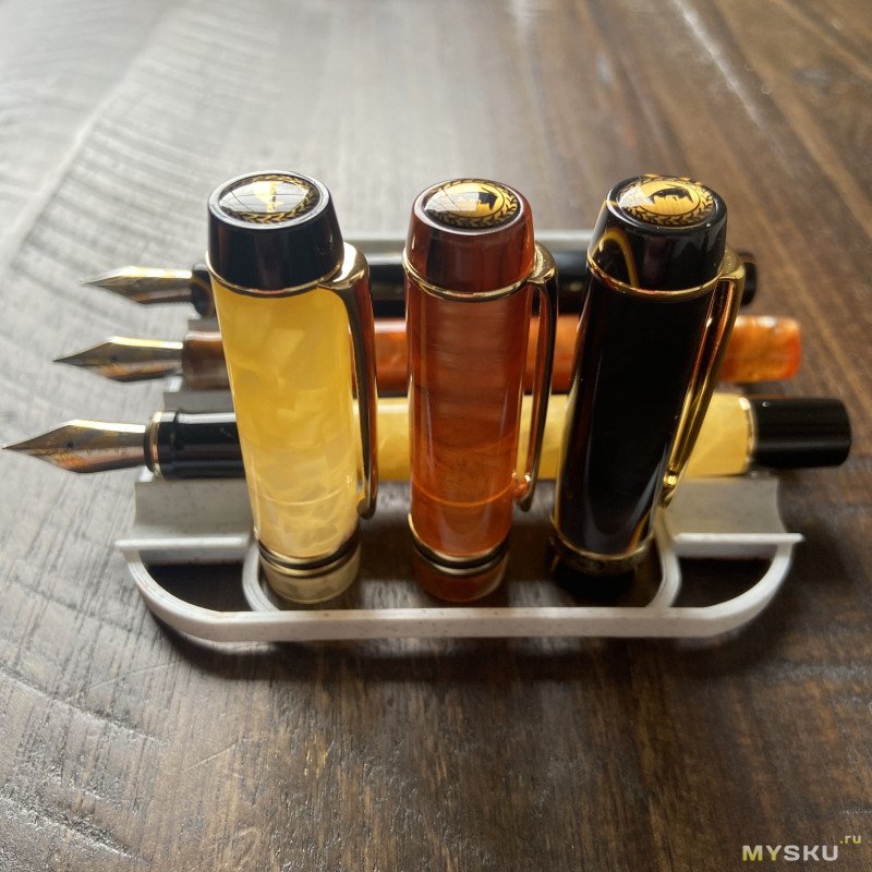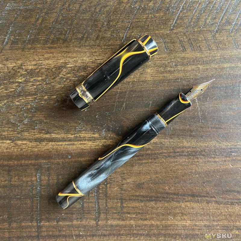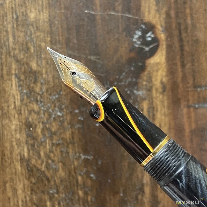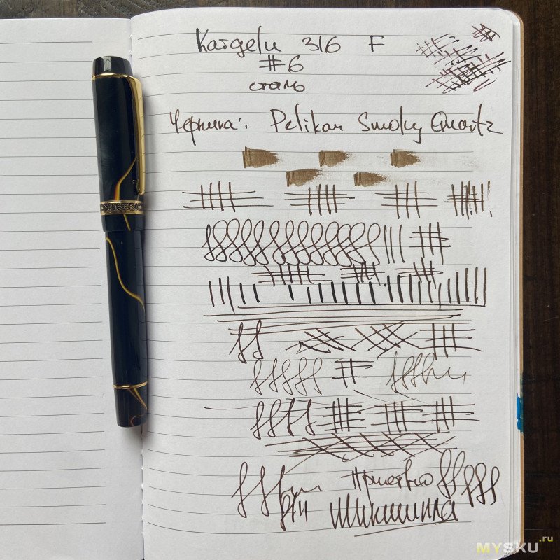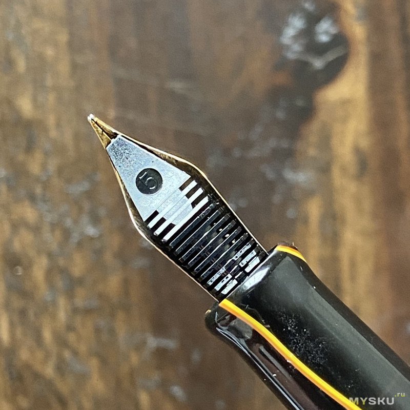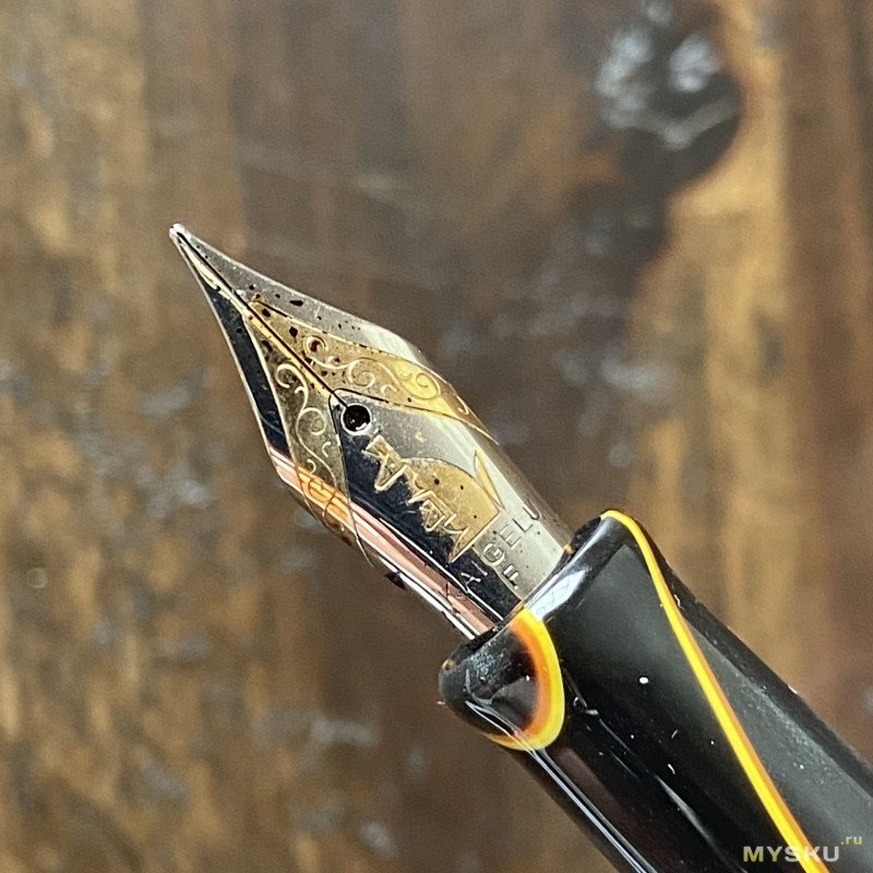 Перо пишет хорошо, чуть шумновато, с небольшим звуковым фидбеком, достаточно обильная подача — на перо можно чуть поднажать, подача прекращаться не будет, фидер отлично справляется со своей задачей. Линия шире, чем заявлено.
