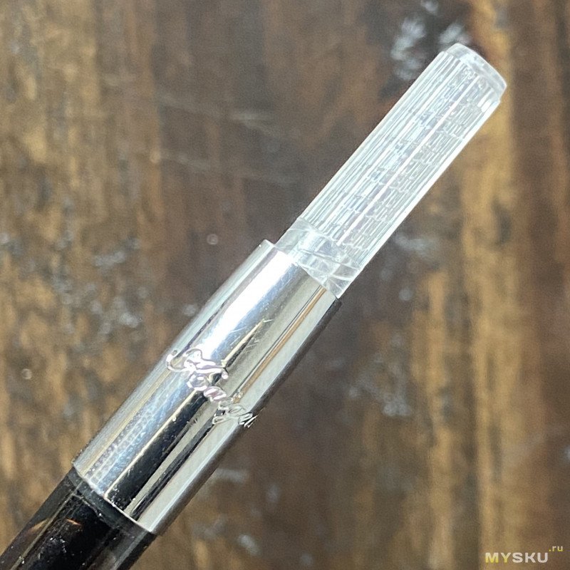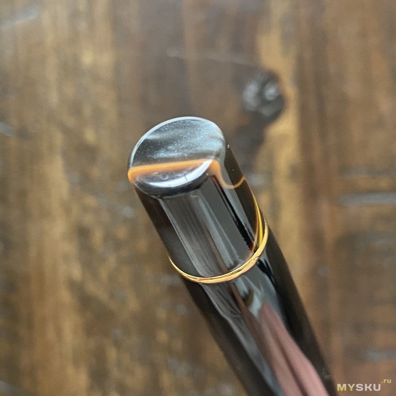 Колпачок… Ну до чего же красивое колечко на нём! Клип чуть сужается к краю, простой, но изящный, и совершенно нефункциональный, тугой до безумия. Пластик мерцает и переливается, но кое-где в нём встречаются какие-то посторонние вкрапления белого цвета.