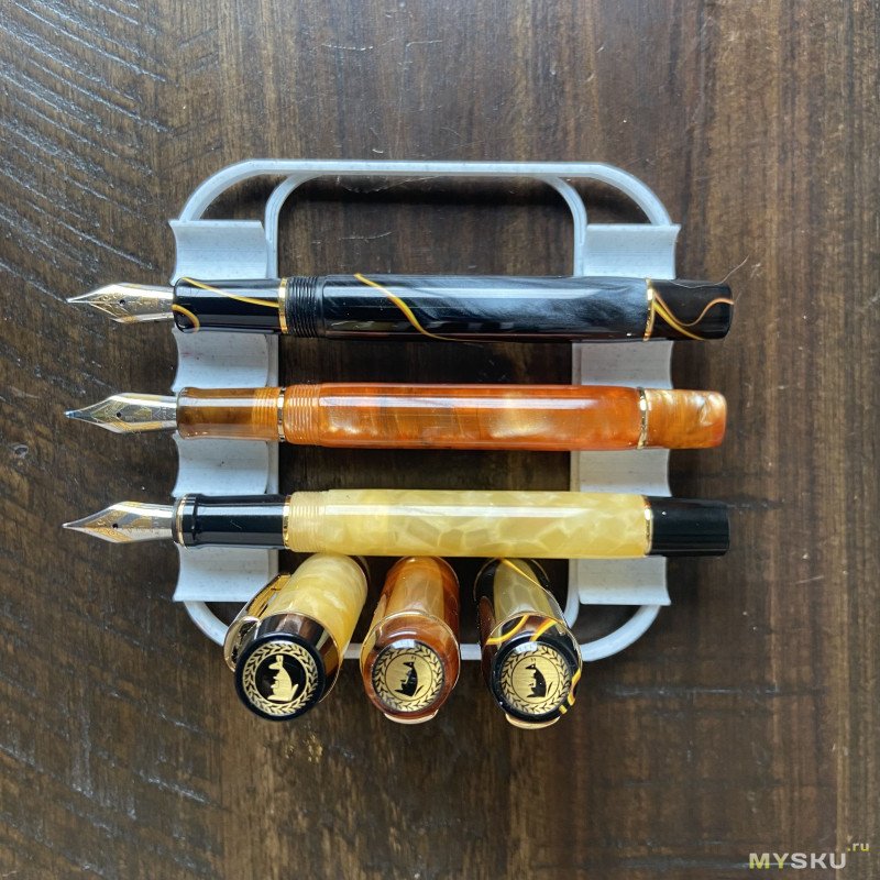 Как-то пока ещё не понятно, как отличить старую версию от новой. Сниму колпачки со всех ручек. Ну вот, ещё два отличия нашлись — у нижней секция чёрного цвета и есть колечко около пера, и медальон реверсивных цветов относительно двух других ручек.