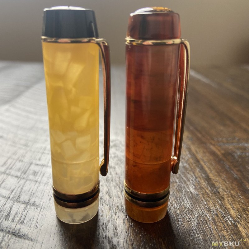 Ну теперь можно «вскрыть» все карты и сделать предположение, которе мне кажется верным — у старой версии два колечка на колпачке и чёрного цвета секция и навершия на торцах. Но если всё ещё сомневаетесь — взвесьте ручки, да или просто оцените в руке. Старая версия весит около 38 грамм, новая — всего 25 грамм. Таким образом, у моделей 316 — красивейших замесов акрил, у моделей 316A — более полновесные и более простые по узорам корпуса.