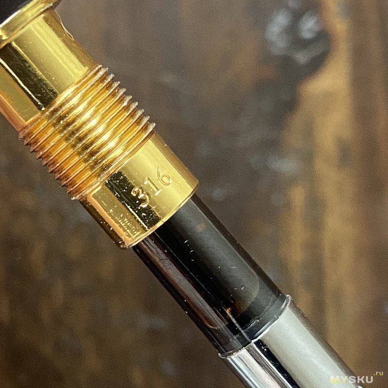 Что же внутри ручки? Всё просто — конвертер, достаточно простой, но брендированный. Втулка секции металлическая, на корпусе резьба внутри пластиковая, по кругу написано «Kaigelu 316». Конвертер держится довольно слабо.