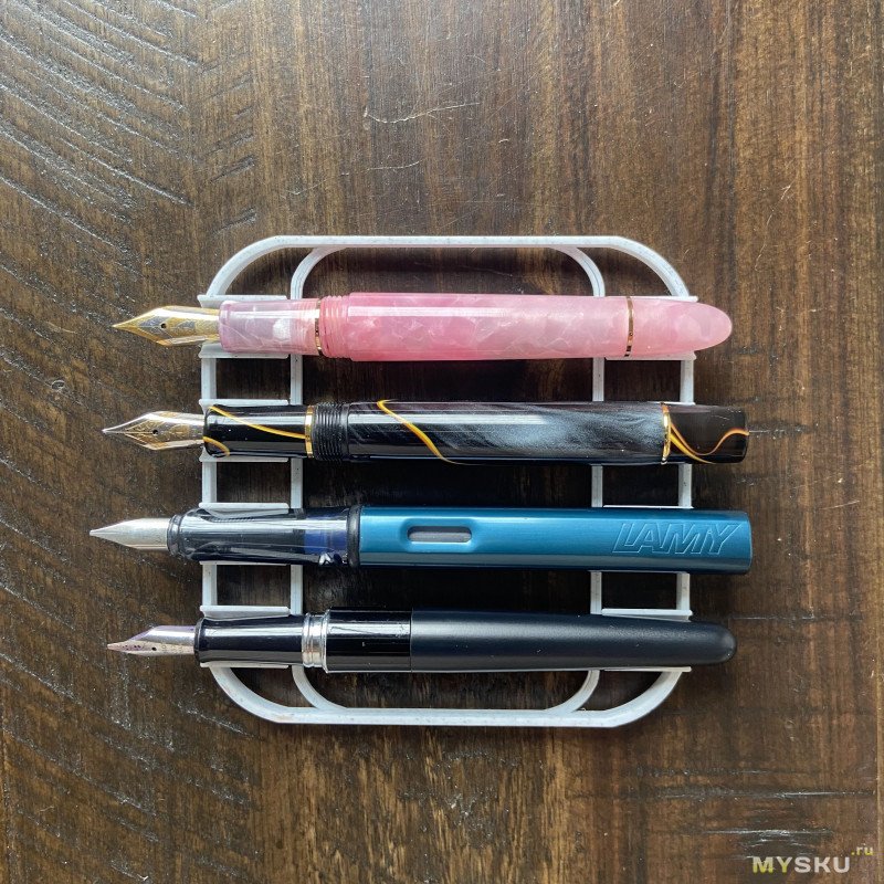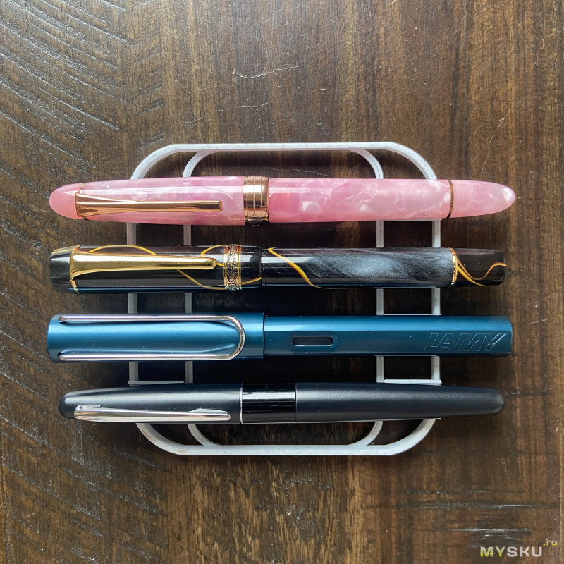 Раз уж достал все ручки, можно сразу сделать стандартное сравнение размеров со стандартными ручками, к которым в этот раз добавлю китайского брата. Сверху вниз: Kaigelu 356, Kaigelu 316, Lamy Al-Star и Pilot Metropolitan. Видно, что ручка вполне себе хороших размеров — не большая и не маленькая, а в самый раз.
