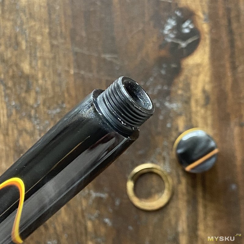 Откручу колпачок — на это мне понадобится почти три оборота, так себе результат, и под ним скрывается приталенная секция в цвет корпуса, отделённая от от корпуса колечком. Резьба совершенно неострая, ступенька от секции к корпусу минимальная.