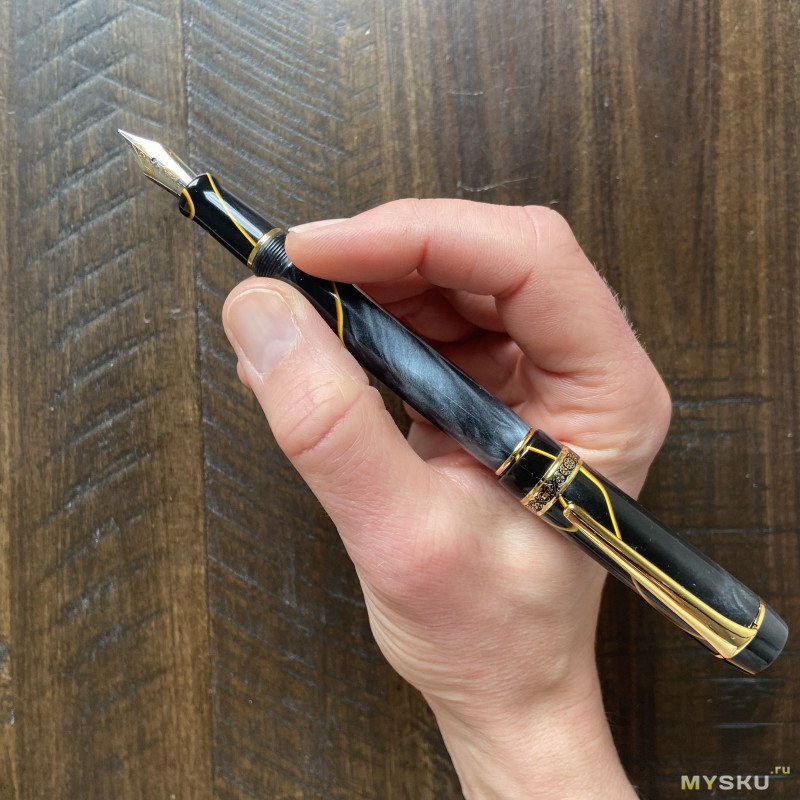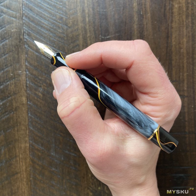 Что же касается весов и длины ручки, то вот спеки. Вес: 26 граммов, из которых 16 грамм — корпус и 10 — колпачок. Длина в закрытом состоянии 13,5 см, без колпачка — 12,5 см, с надетым на ручку колпачком — 17,5 см. Система заправки — картридж-конвертерная.