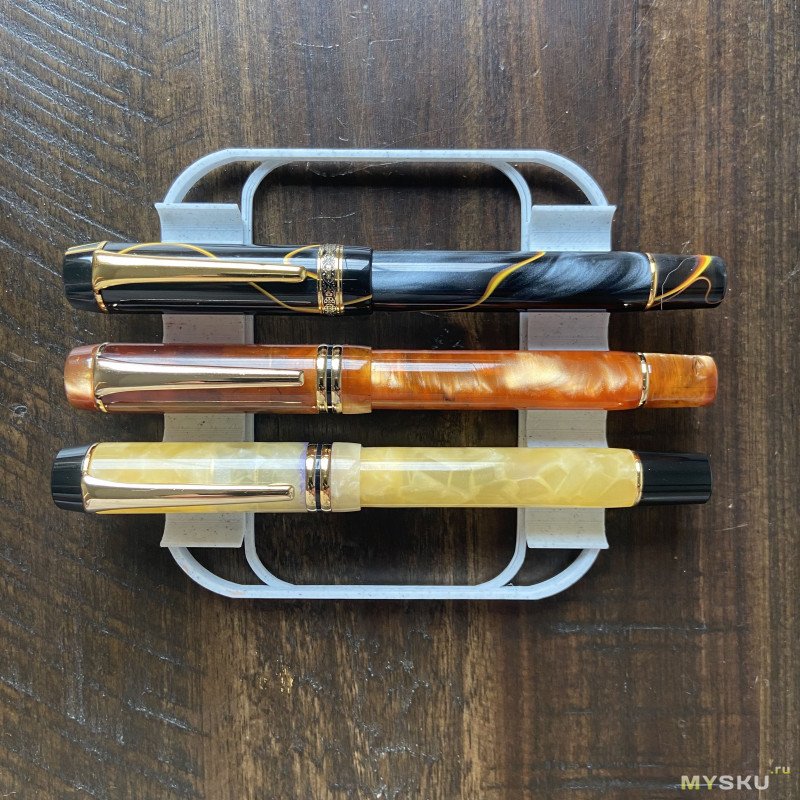Вообще, по идее, надо бы рассказать, в чём отличие модели 316 от 316A (я вообще не думаю, что 316A — это официальное название, просто некоторые продавцы стали так маркировать ручки, чтобы отличить одну итерацию от другой). Если положить рядом несколько итераций модели 316, то можно заметить несколько деталей: на нижней ручке чёрные навершия на торцах колпачка и корпуса и два колечка на колпачке, на средней — два колечка и навершия в цвет корпуса, на верхней — навершия в цвет корпуса, но колечко одно и красивой резной формы.