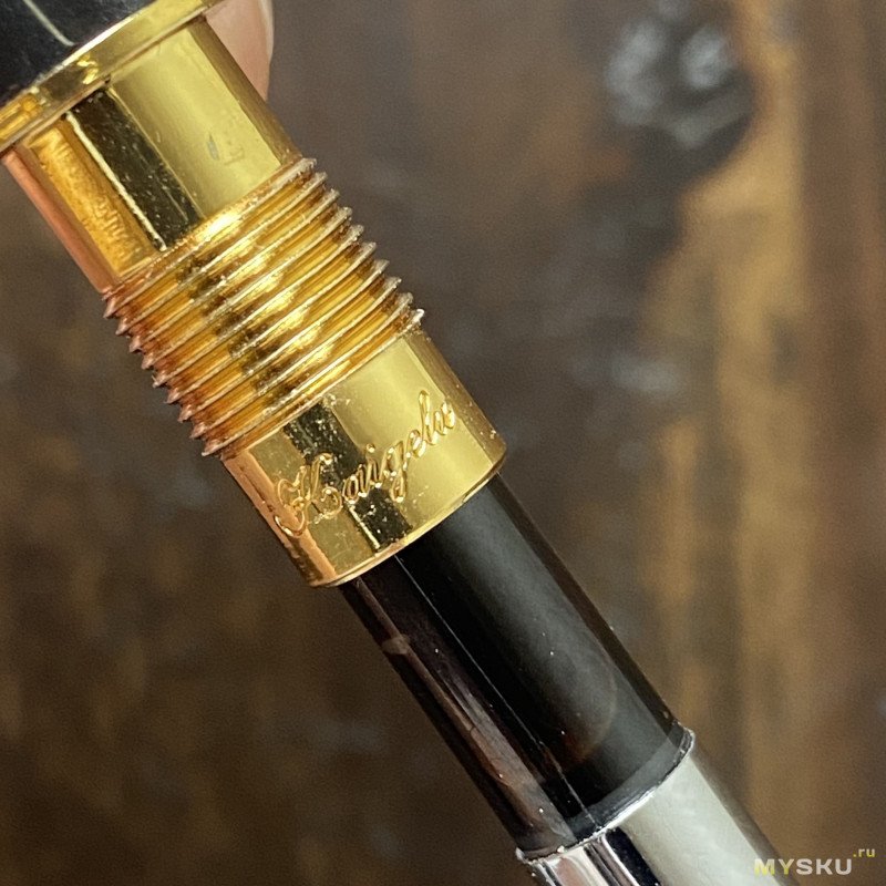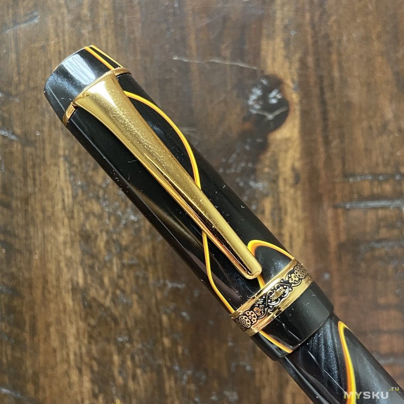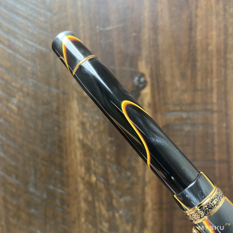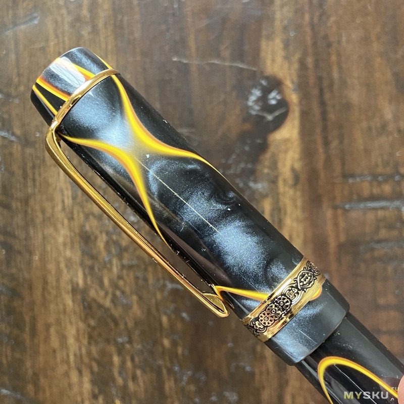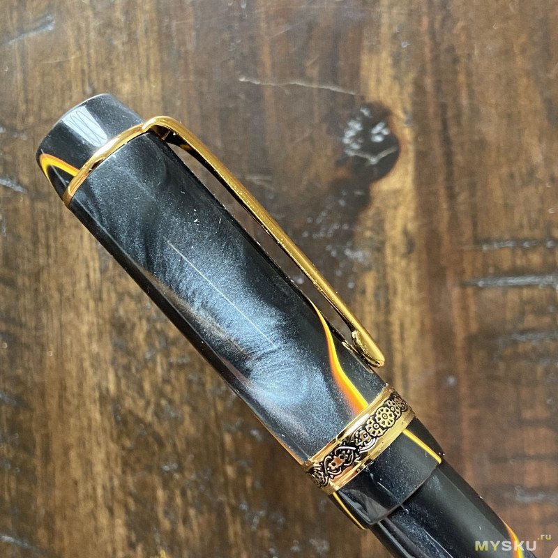 С одной стороны, я не очень люблю перья на их ручках, из моего опыта два из шести были плохими достаточно, чтобы отбить желание покупать их ручки, с другой стороны — очень уж красивый акрил у них, никак не пройти мимо. Вот и этот пишущий инструмент зацепил меня своими завитушками в цвет фурнитуры и чёрно-серым мерцающим пластиком. Ну посмотрите сами — разве можно пройти мимо?