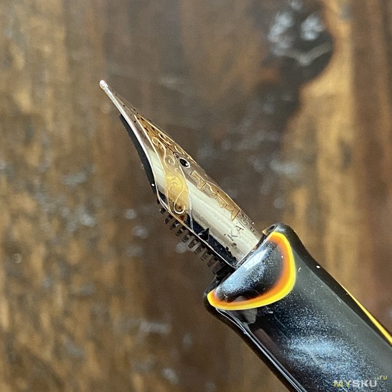 Перо стальное, шестого размера, двутоновое, на пере — логотип и название компании, плюс размерность пера (в моём случае — F). Фидер обыкновенный, пластиковый. Перо с фидером вставлены в перьевой блок, который легко выкручивается (перо тоже вытаскивается без проблем, если надо обслужить или поменять).