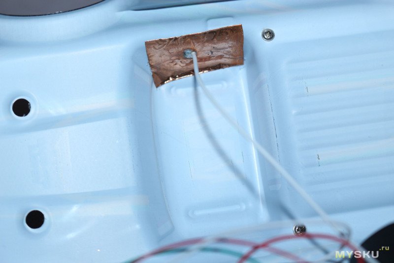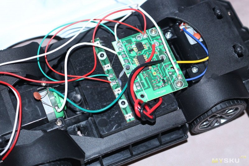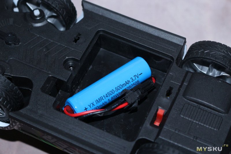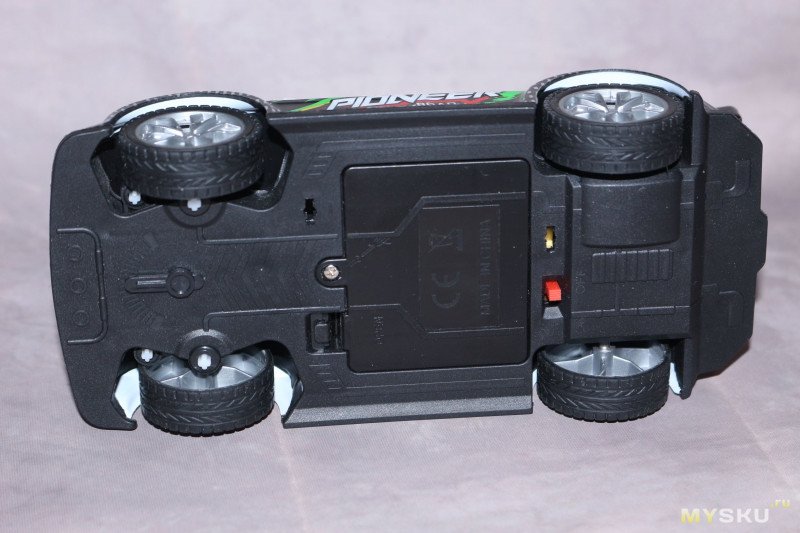 Шасси из толстого плотного пластика. На днище размещены батарейный отсек с установленным аккумулятором 14500 на 500 мАч, выключатель и регулятор нулевого положения колес.