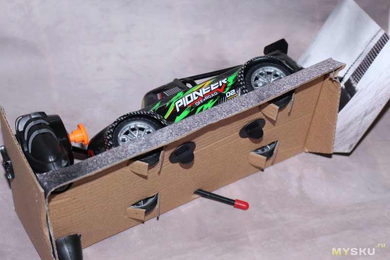Коробка яркая, с прозрачной “витриной”, внутри машина и пульт закреплены пластиковыми защелками на картонной вкладке.
