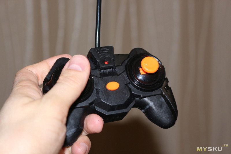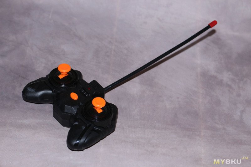 Пульт по размеру и ребенку не крупный, и взрослому не мелкий. Питается от двух батареек АА, канал передачи 27 мГц, дальность около 15 метров. Кнопка по центру включает и отключает подсветку и фары.