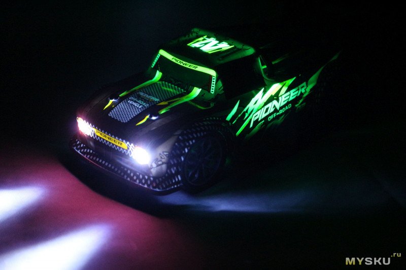 У машинки рабочие передние фары, также имеется посветка корпуса. Выглядит отлично, особенно в темноте или сумерках.