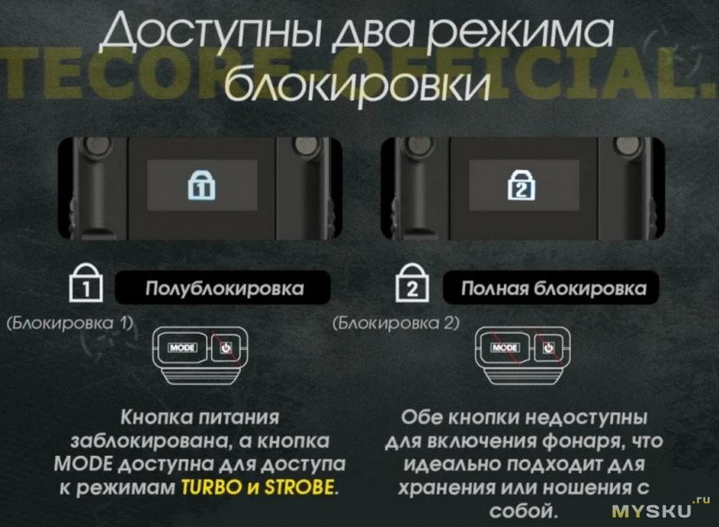 Фонарик поддерживает частичную и полную блокировку кнопок, чтобы исключить случайное включение.