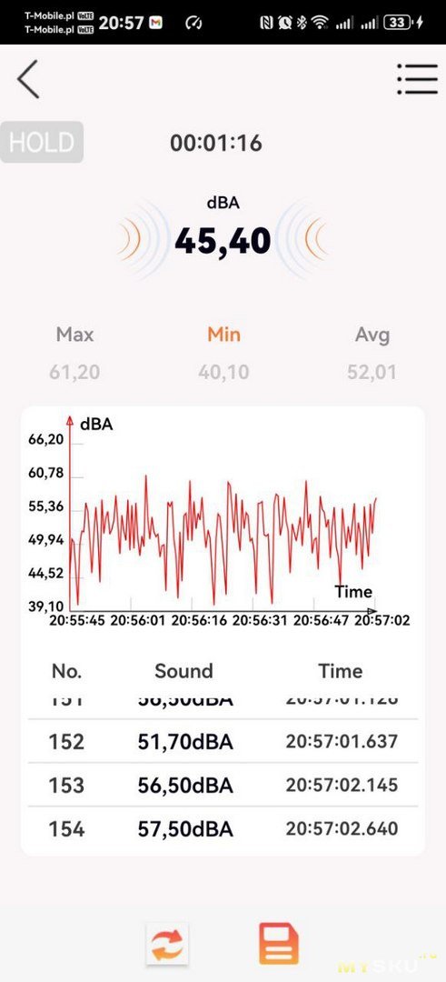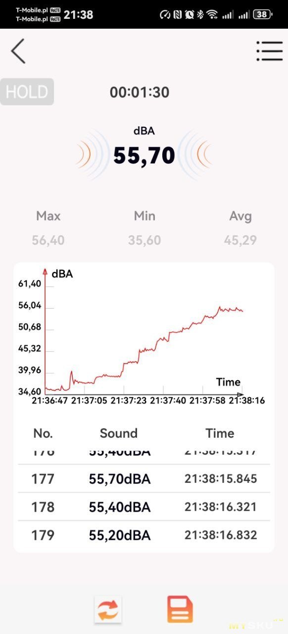 36.00dBA-тишина в комнате, маленький пик это нажатие кнопок на пульте возле измерителя, а каждая ступенька-увеличение мощности вентилятора и так до 55.20dBA