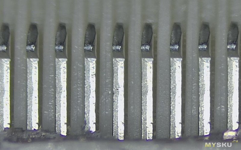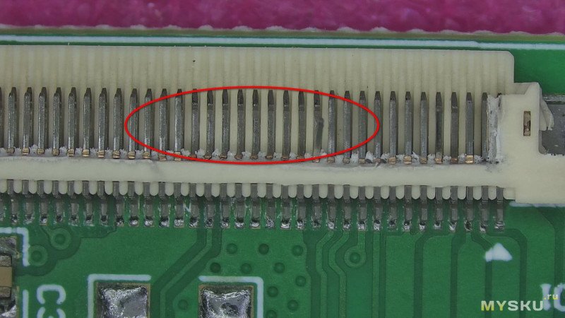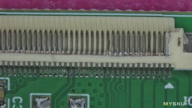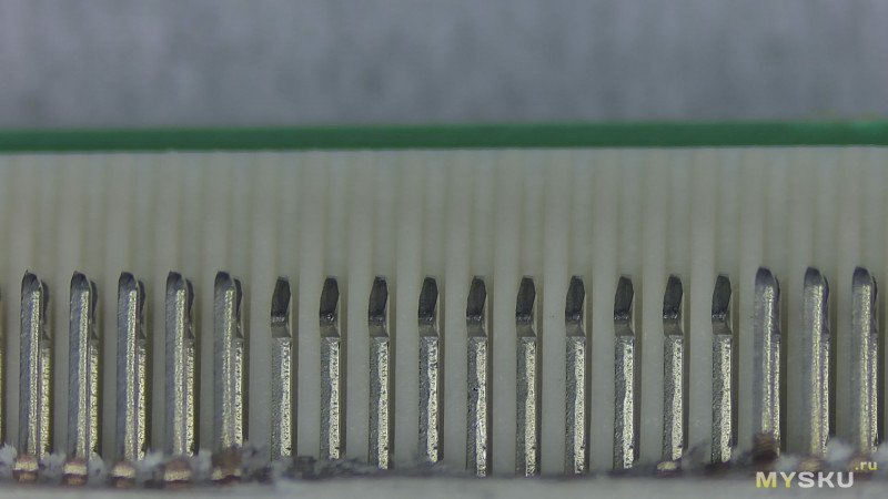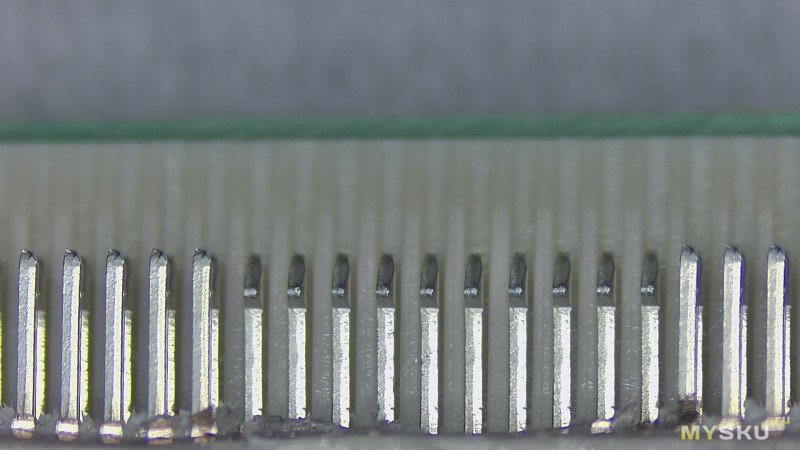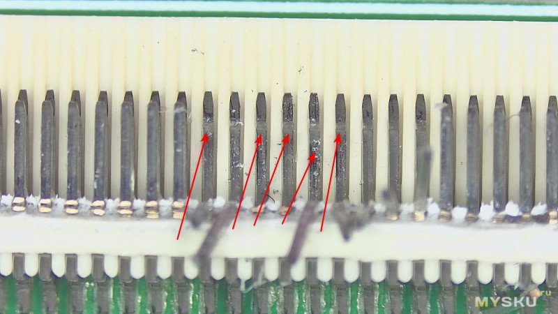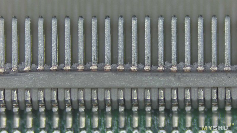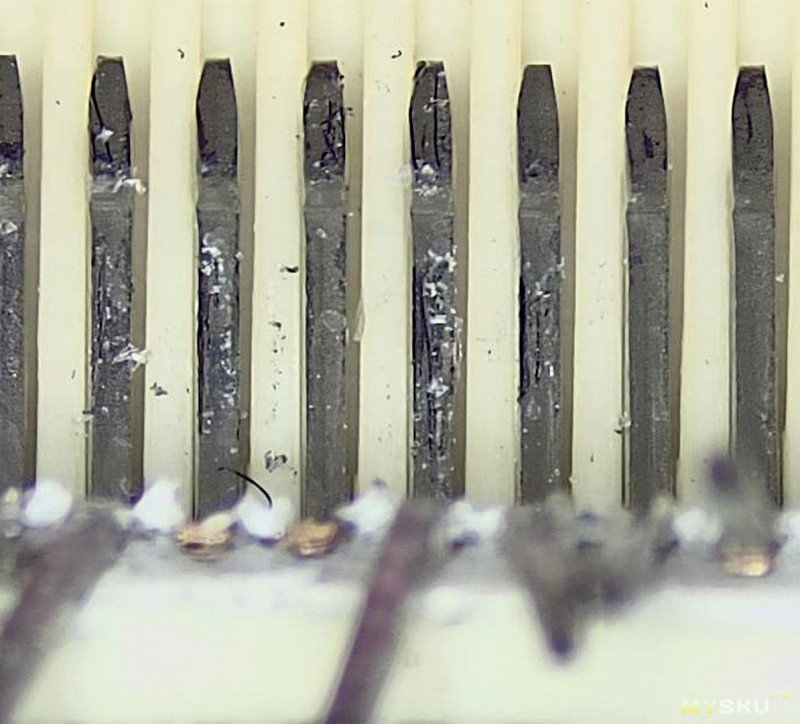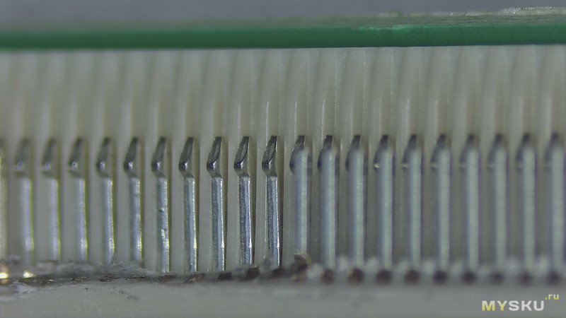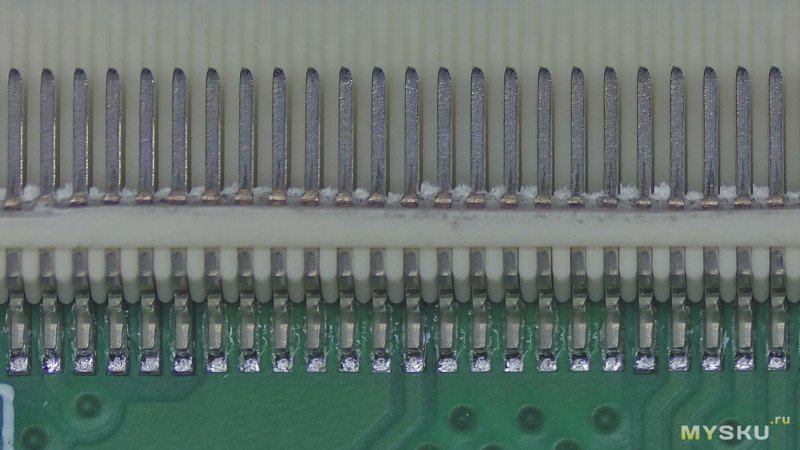 Я не делал окончательных выводов о том, из-за чего возникла такая разница в качестве контакта у разъёмов. Причин может быть несколько. Возможно, сыграли роль не самые удачные условия хранения. Возможно, виновата окружающая среда, и на контактах осело какое-то вещество (хотя разъёмы до установки хранятся в лентах и бобинах и упакованы достаточно герметично). Не исключено и то, что проблемы возникли уже после пайки — например, из-за попадания флюса или его испарений.