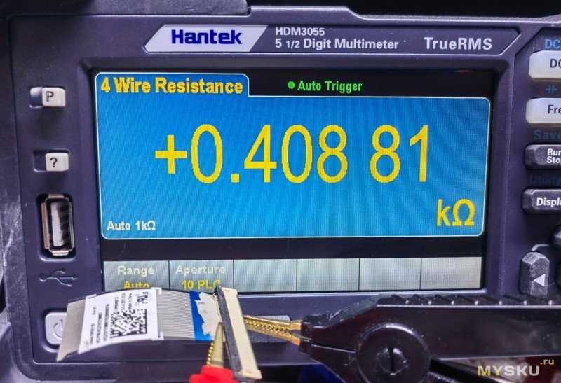 Также были выполнены измерения контактов разъёма со вставленным в него шлейфом. Для этого я взял кусочек шлейфа, зачистил его, закоротил все дорожки между собой с обеих сторон и вставил в разъём. После этого проводил измерения сопротивлений по контактам.